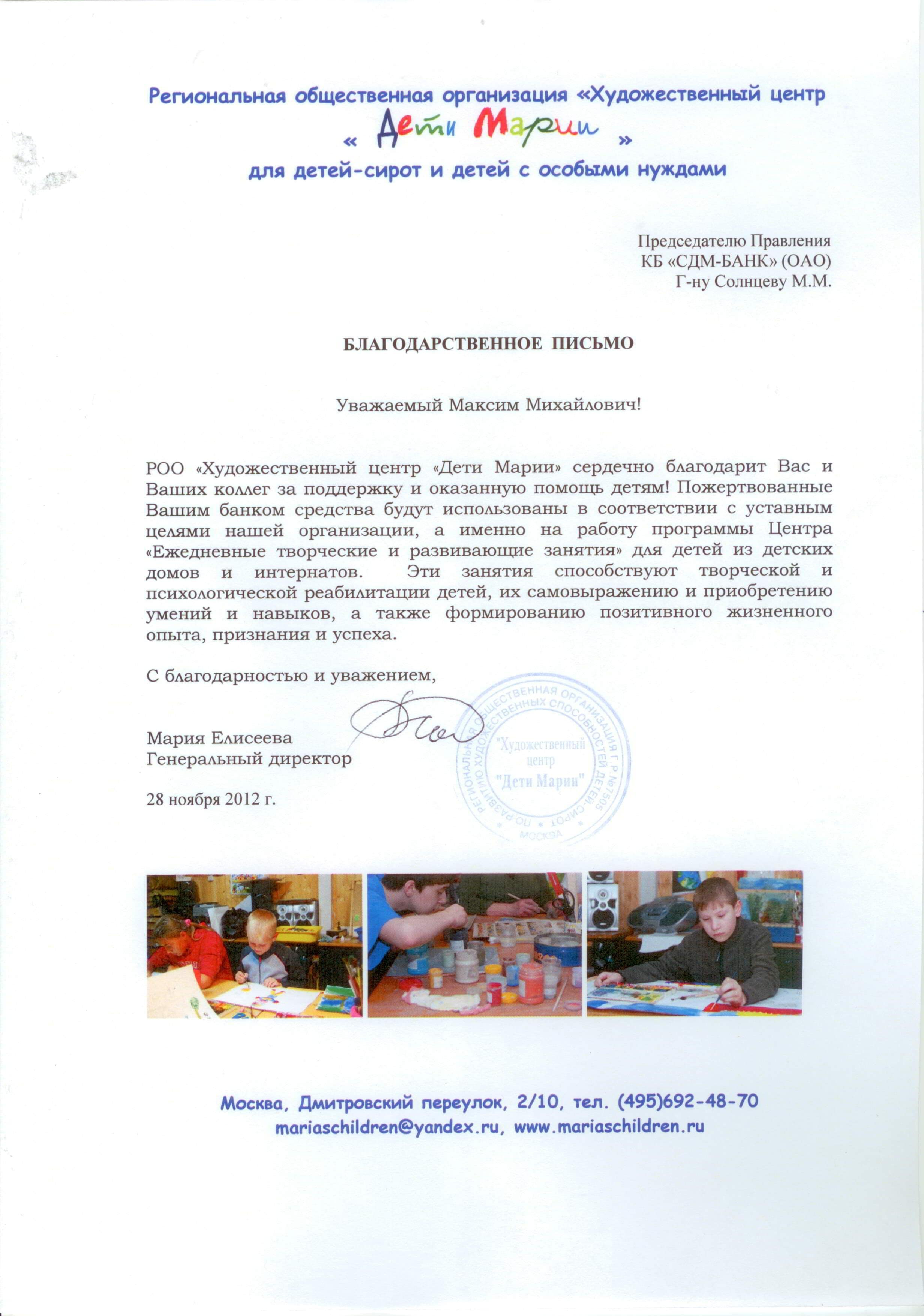В ноябре 2012 года КБ «СДМ-БАНК» (ОАО) безвозмездно перечислил в качестве благотворительной помощи на счет Региональной общественной организации по развитию художественных способностей детей-сирот «ХУДОЖЕСТВЕННЫЙ ЦЕНТР «ДЕТИ МАРИИ» триста тысяч рублей. Пожертвование будет использовано в целях реализации и развития программы ежедневных творческих и развивающих занятий.